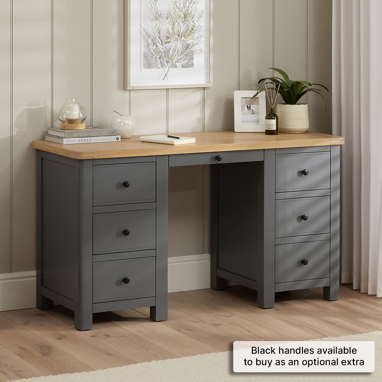 The large dressing table top provides plenty of space for your make up and a mirror and there is loads of storage due to the six large drawers in the twin pedestals and a smaller central drawer. This dressing table is supplied with two types of brushed nickel handles (Round Knobs and Cup handles) giving you the choice to use whichever you prefer as they both perfectly complement the furniture. As an optional extra we also offer these handles in a black painted finish if you would prefer more of a contrasting look.