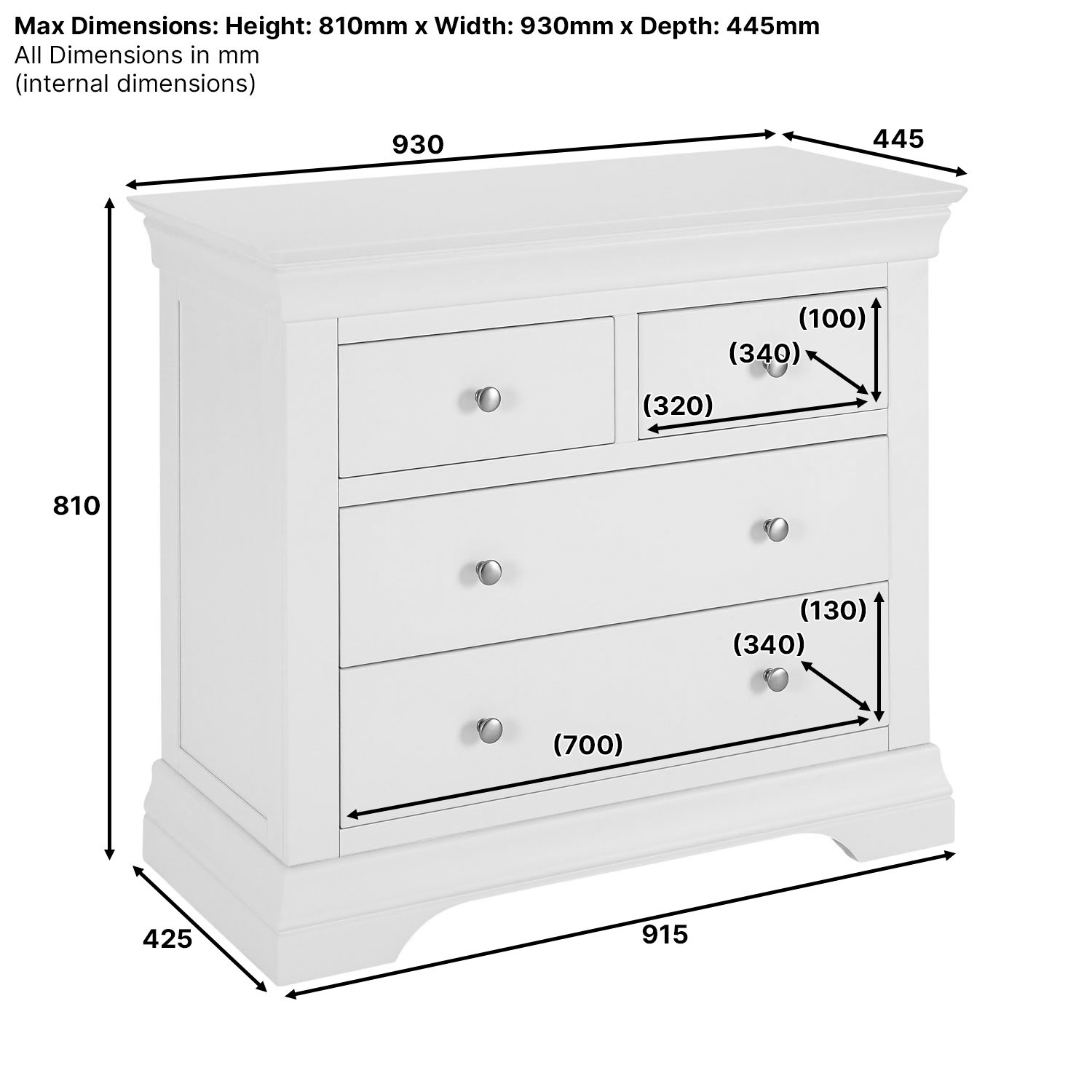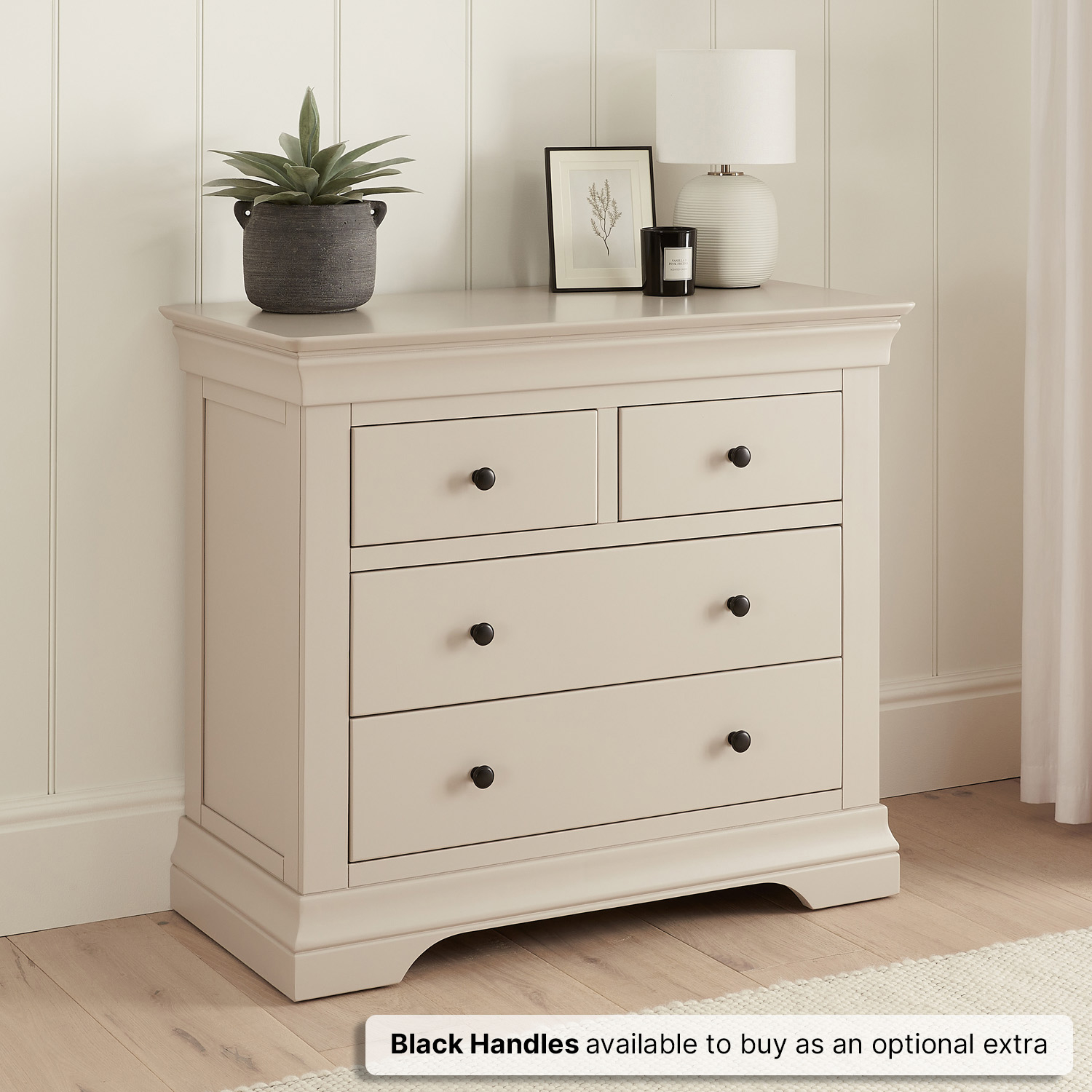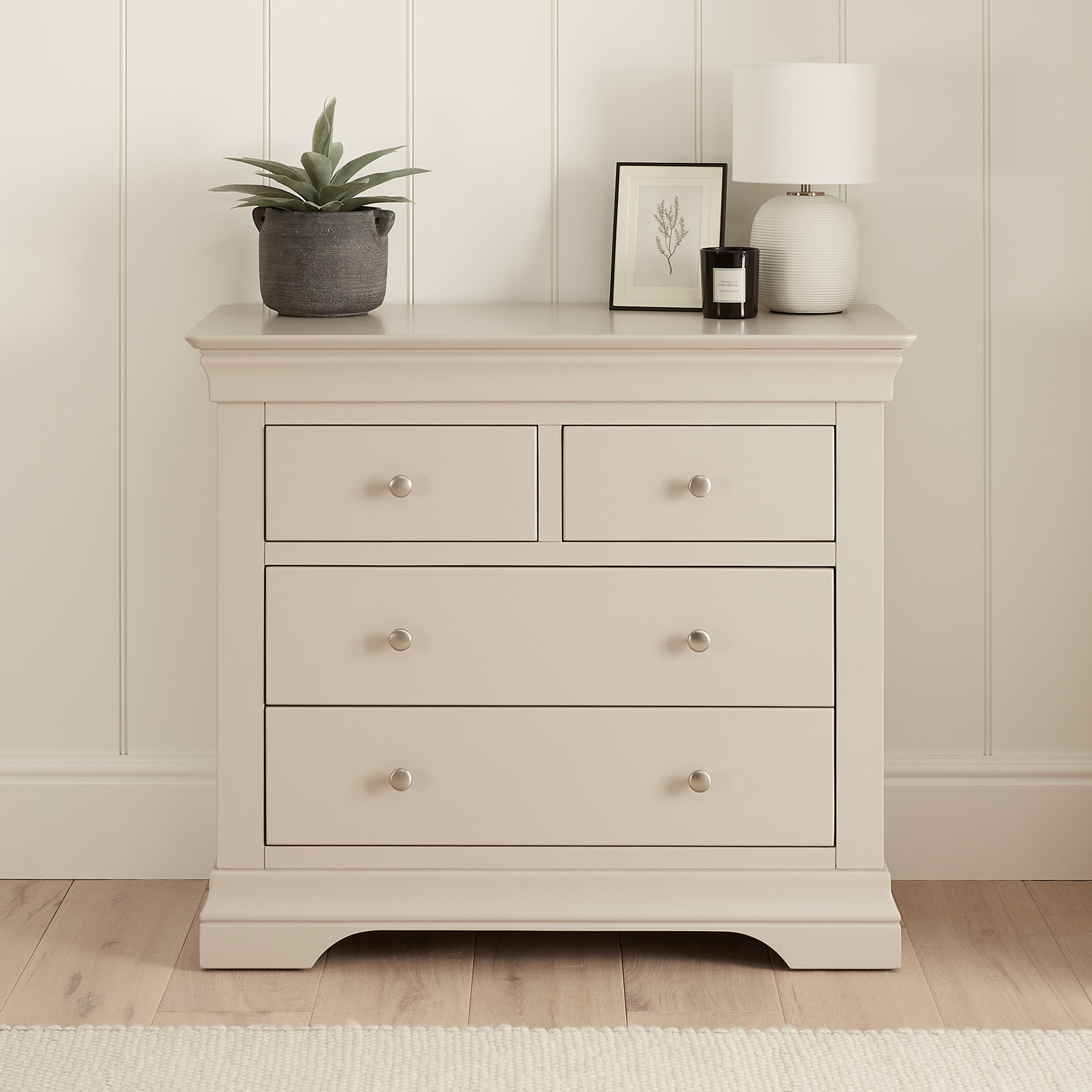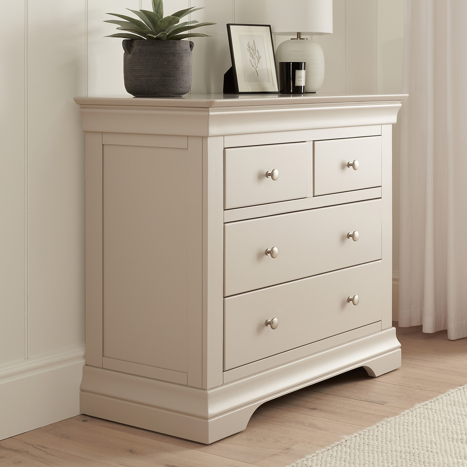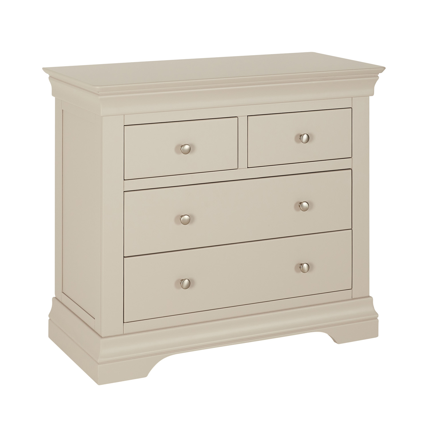 Wilmslow Dove Grey Painted 2 over 2 Drawer Chest – This mid-sized chest features two smaller drawers over two large drawers providing you with plenty of storage space. Perfect for your smalls up top and large items of clothing lower down.
