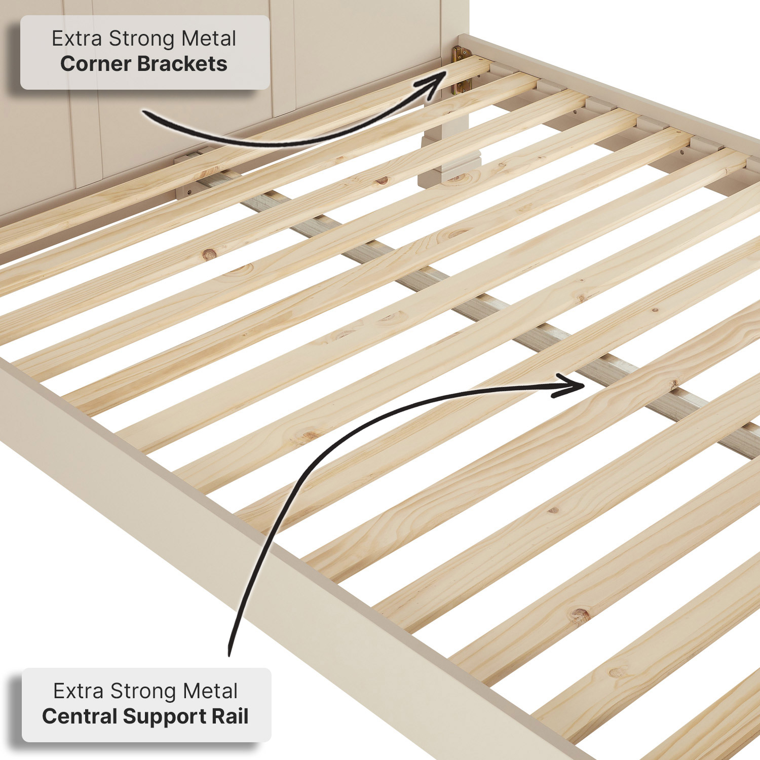 Wilmslow Dove Grey Painted 4ft 6in Double Bed - Add a touch of luxury to your bedroom with this elegant bed. Enjoy a restful night’s sleep due the strong and sturdy bed frame that has solid pine mattress slats, a metal central support rail and metal corner brackets. You can be rest assured this bed has been designed with strength and durability in mind and provides unwavering support and stability.