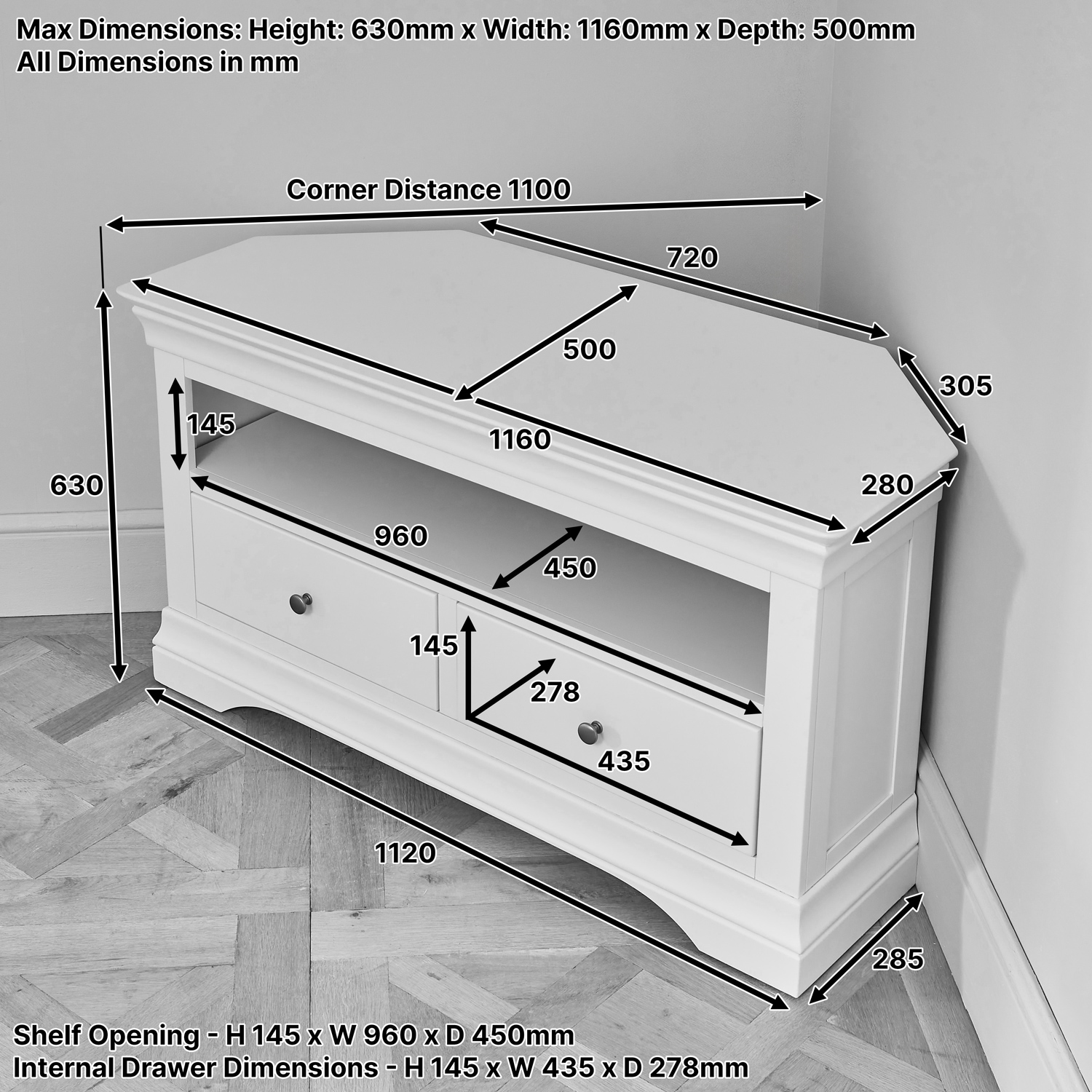 Wilmslow Dove Grey Painted Corner TV Unit – Add a touch of luxury to your living space with this corner TV unit. It is suitable for TV’s up to 50” in size. It features a large open shelf area for media players and two lower drawers for additional storage space. The open shelf area has a hole in the back panel to allow for wires to pass through.
