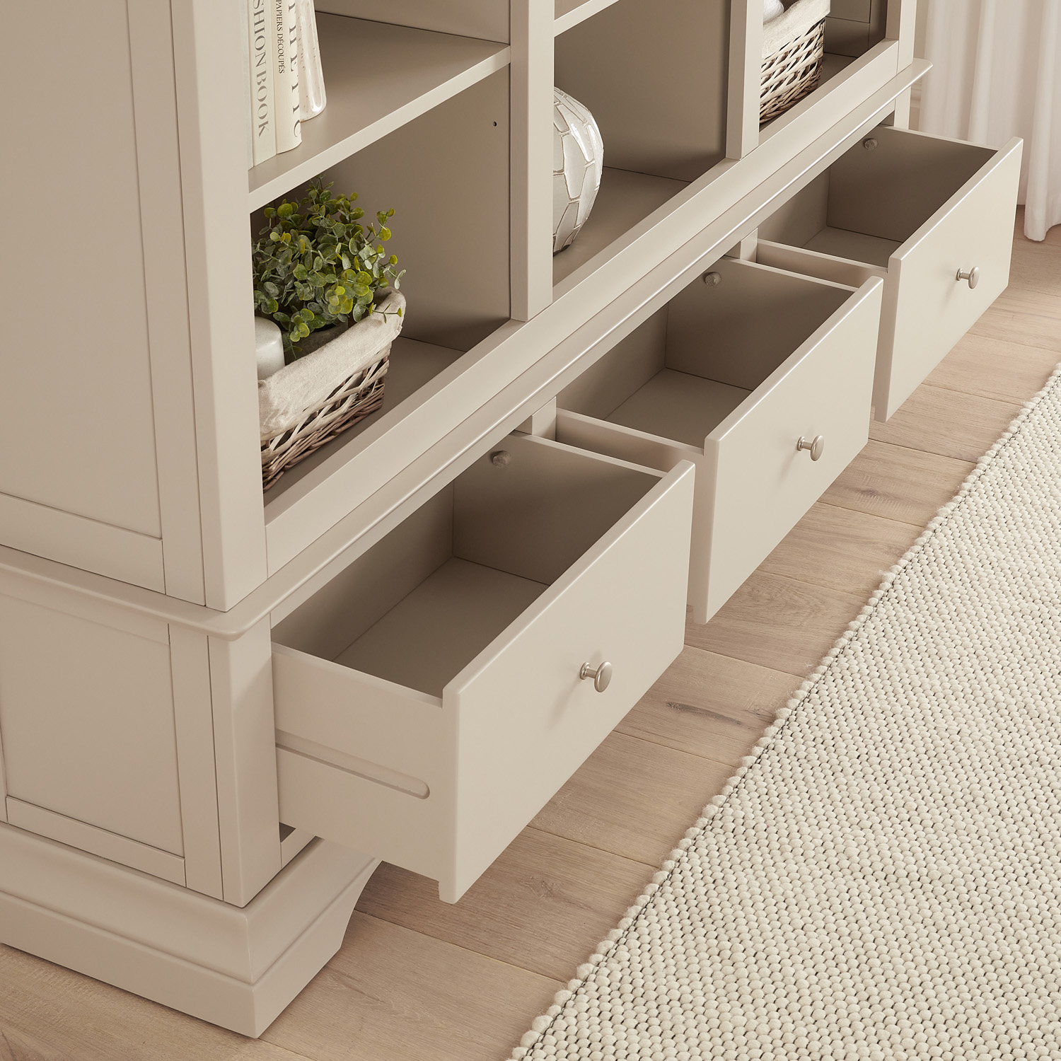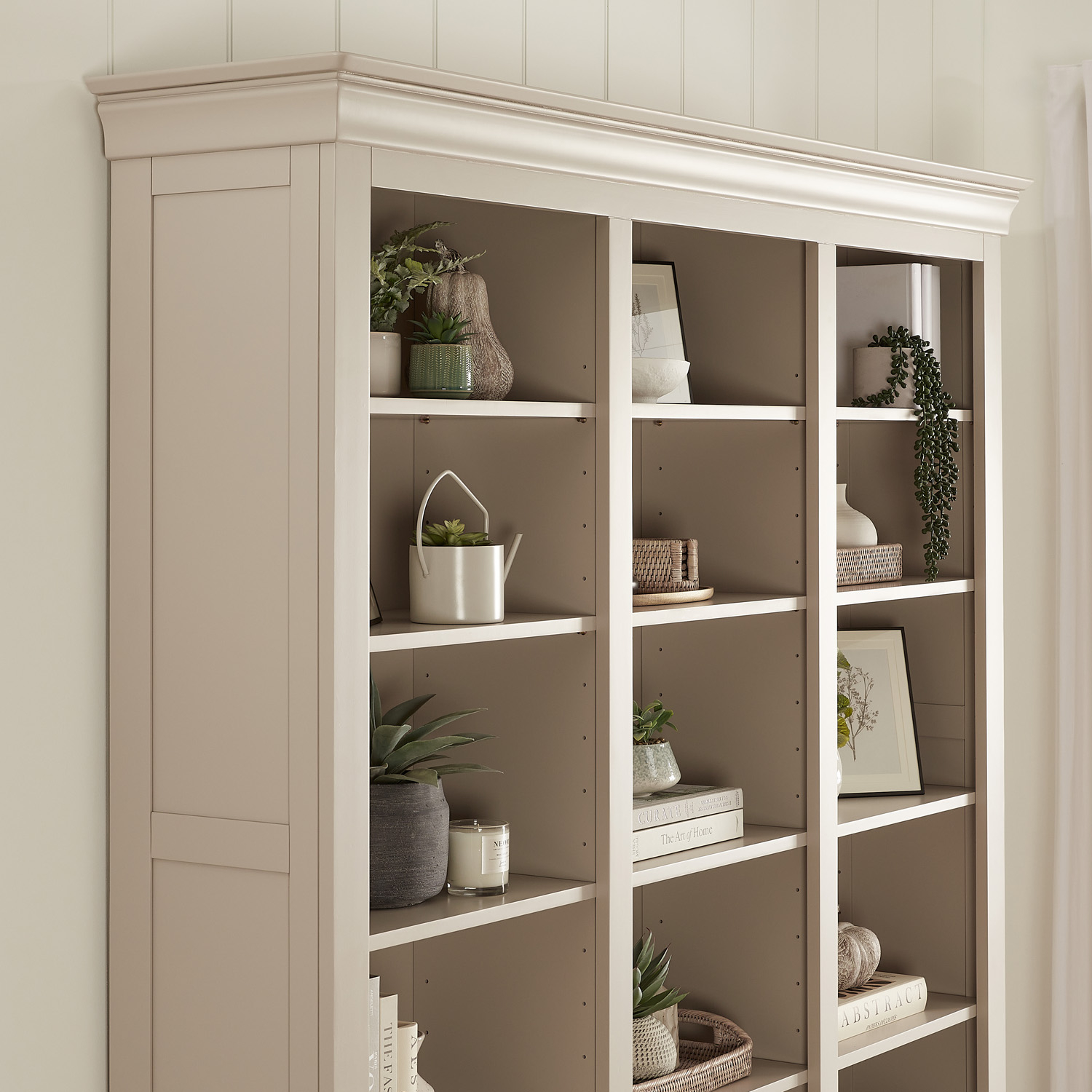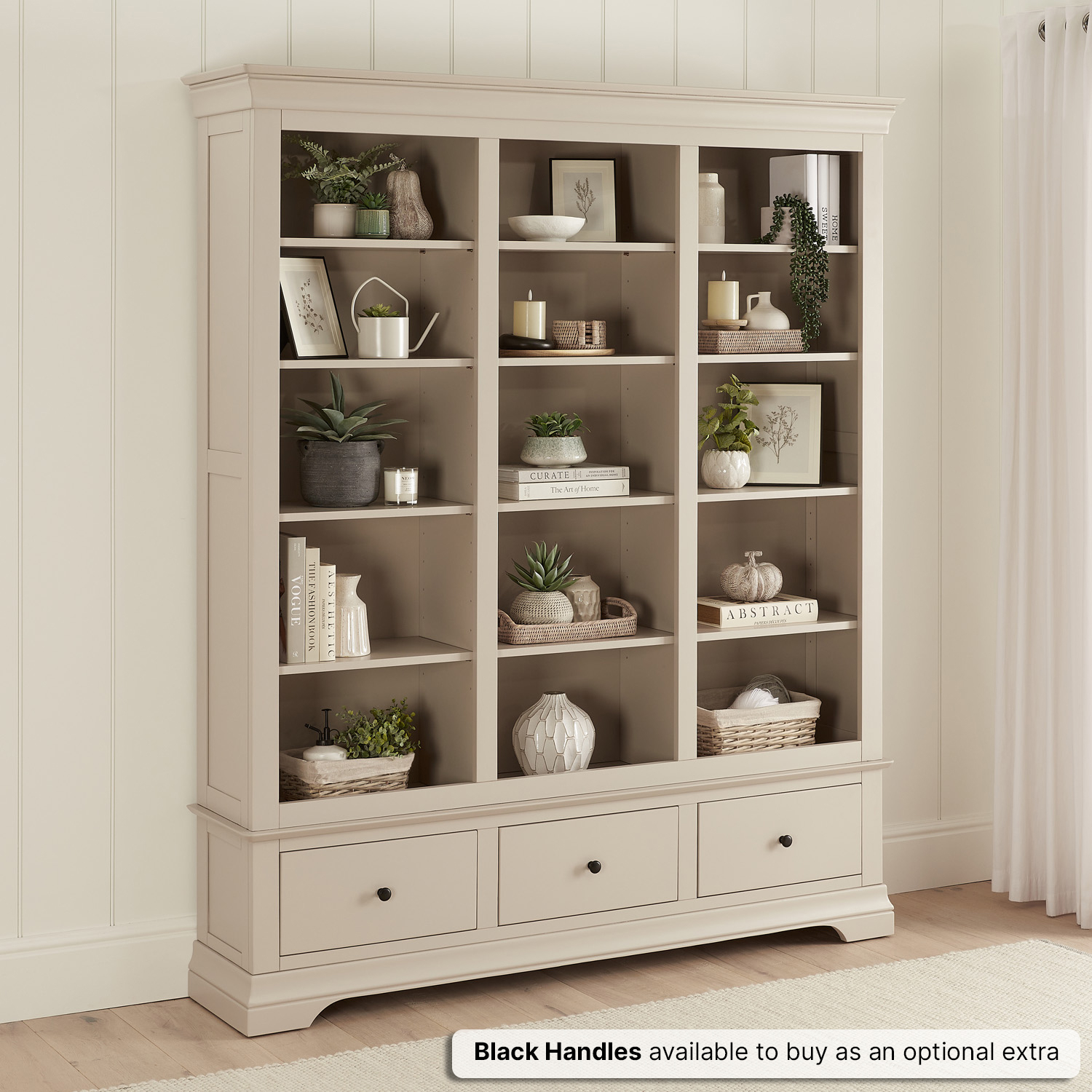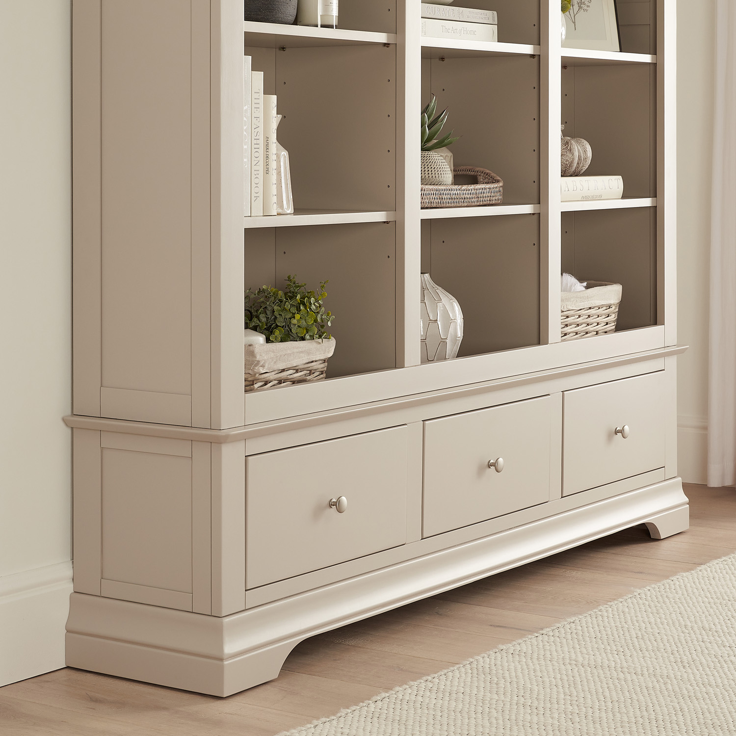 Wilmslow Dove Grey Painted Grand Library Bookcase – This grand bookcase is very impressive and will no doubt become the focal point of any room. It provides plenty of shelf space for all your books and ornaments. It features three large open bays each with fully height adjustable shelves. The base sections has three drawers providing additional storage space.