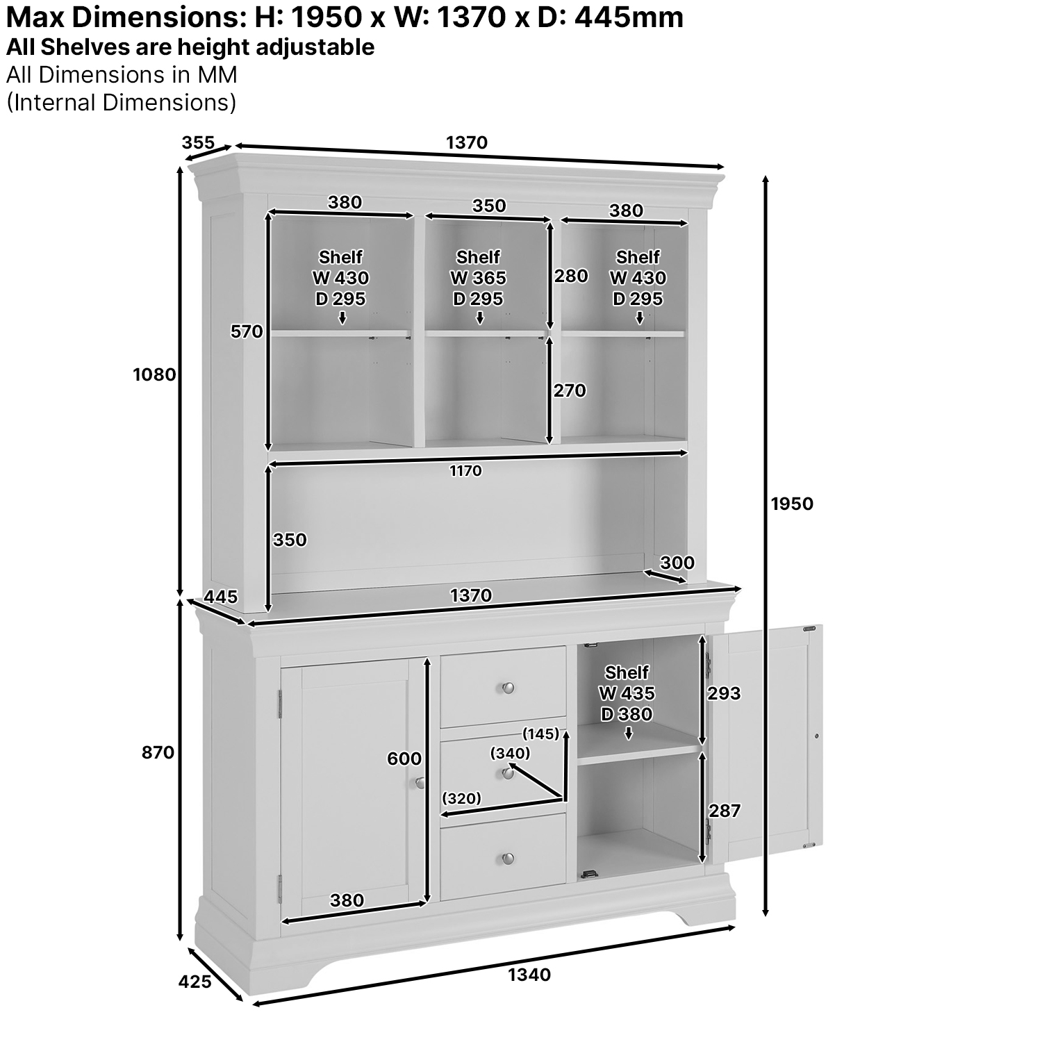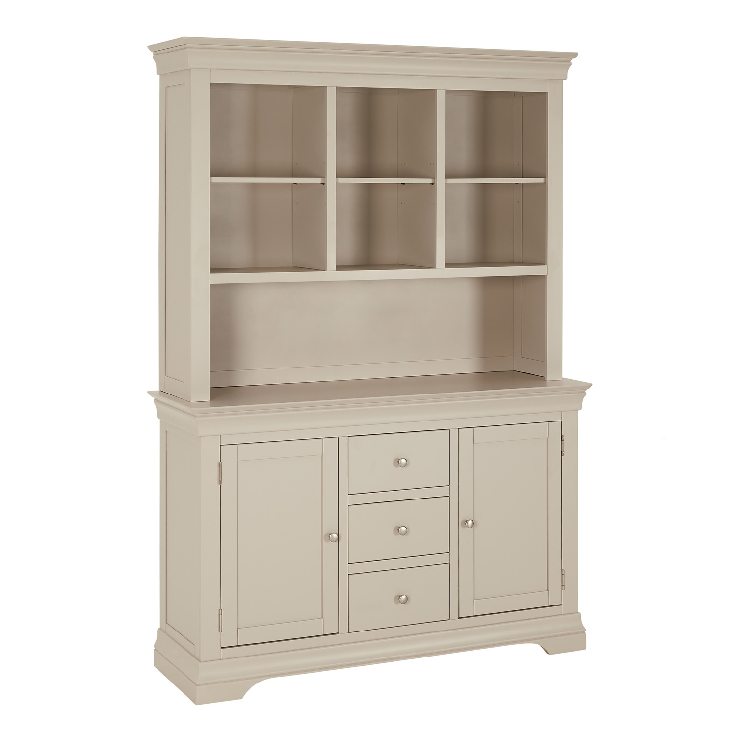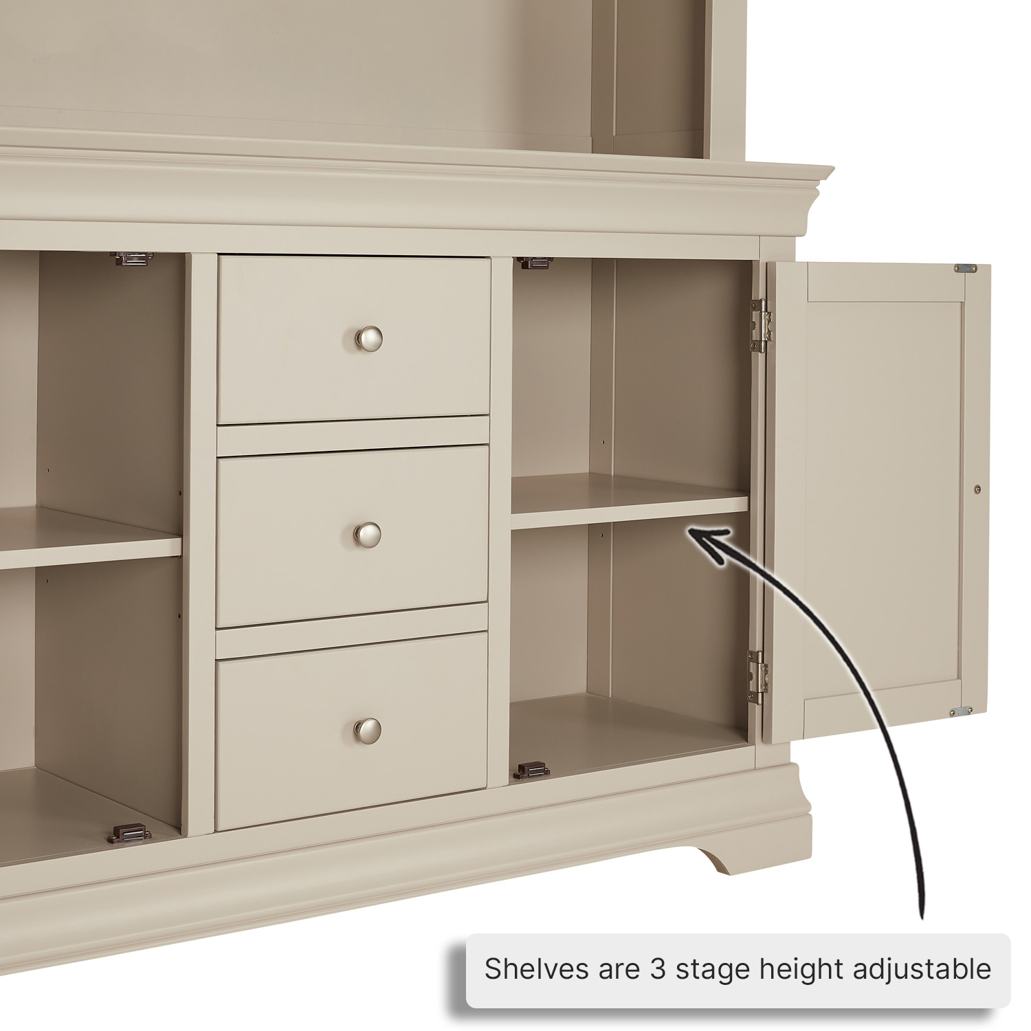 Wilmslow Dove Grey Painted Medium Sideboard with Dresser Top – Add a touch of luxury to your kitchen or dining space with this large sideboard with dresser top. It is a practical size for any kitchen or dining room. It provides plenty of storage and display space due to six open shelf areas in the dresser top and the three drawers and two cupboards in the sideboard base. All the shelves in the dresser top and sideboard cupboards are three stage height adjustable allowing you to configure the layout to suit your needs.