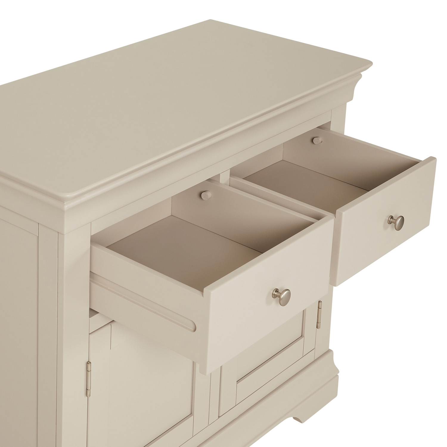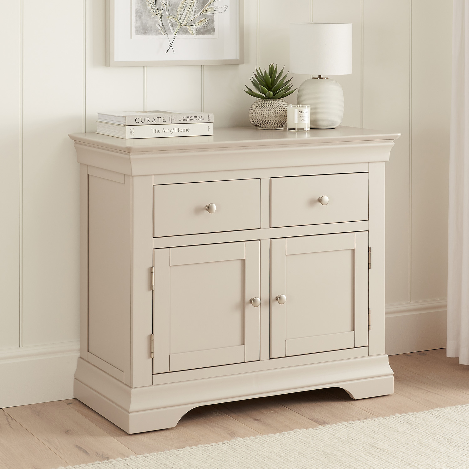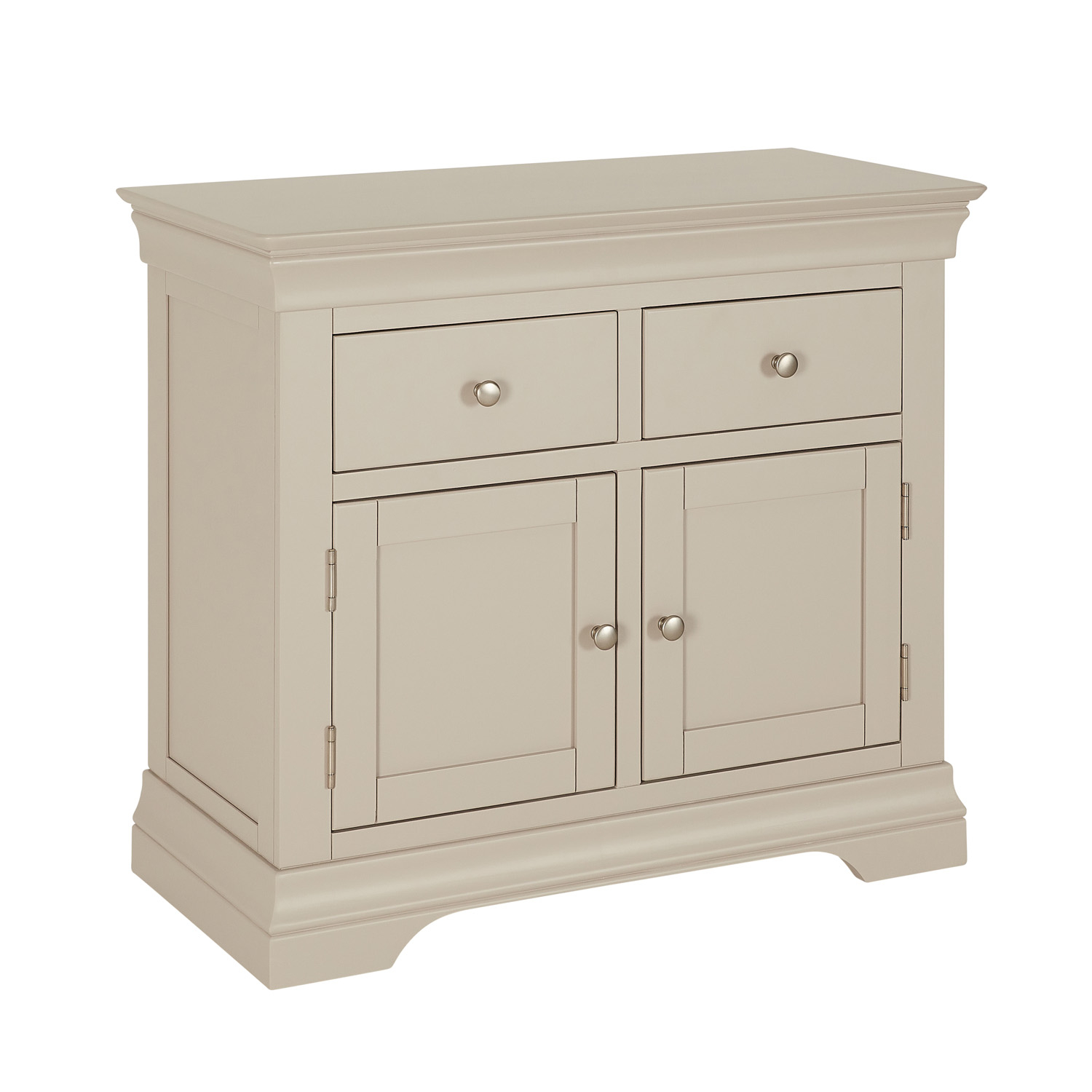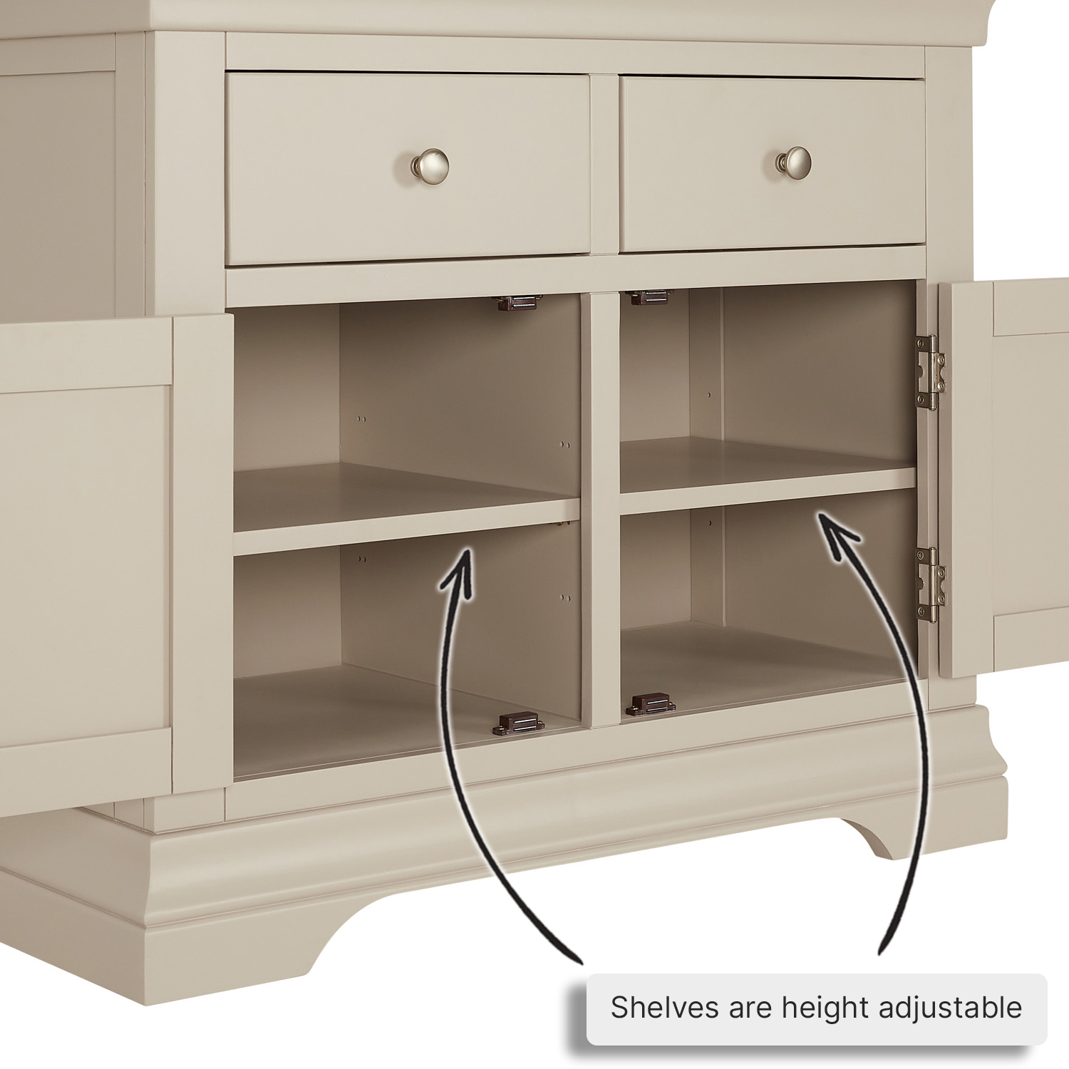 Wilmslow Dove Grey Painted Medium Sideboard – Add a touch of luxury to your living space with this medium sized sideboard. It is a very handy size for any living or dining room. It provides plenty of storage space due to the two drawers and two cupboards, each with a three stage height adjustable shelf.
