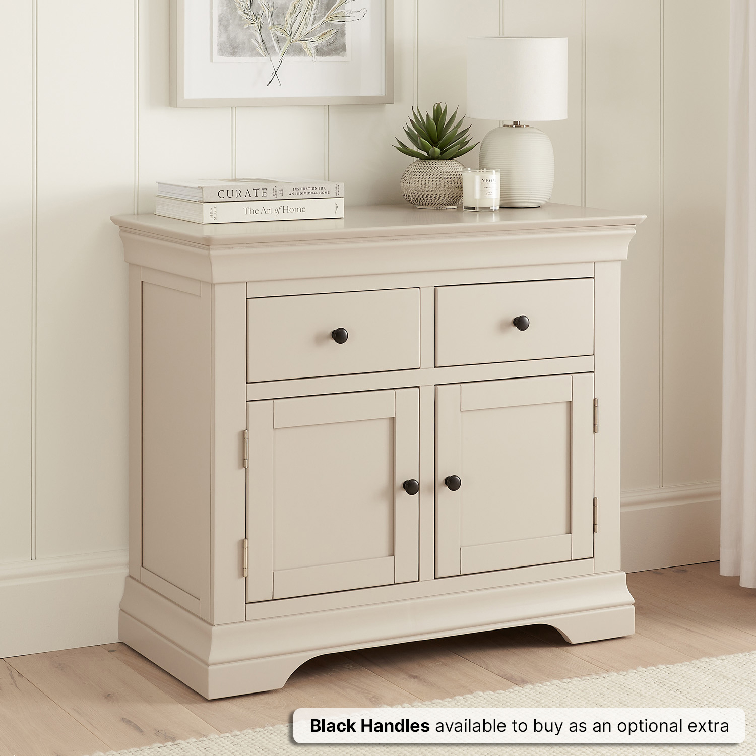 Stylish Brushed Steel Handles – This sideboard is supplied with round brushed steel handles that complement the elegant design. Additionally, black handles are available to purchase as an optional extra, allowing you to customise the look to suit your personal style.