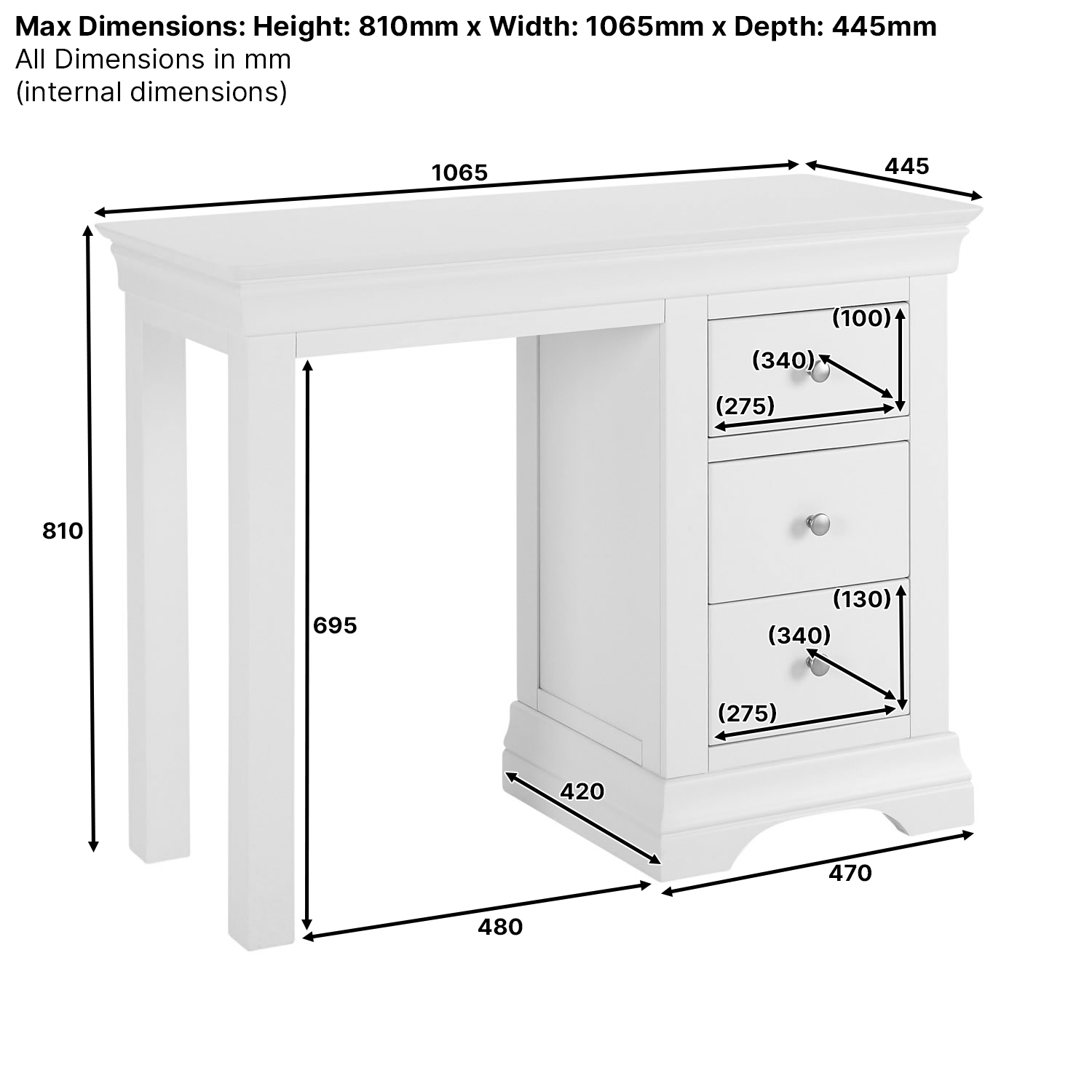 Stylish Brushed Steel Handles – This dressing table is supplied with round brushed steel handles that complement the elegant design. Additionally, black handles are available to purchase as an optional extra, allowing you to customise the look to suit your personal style.