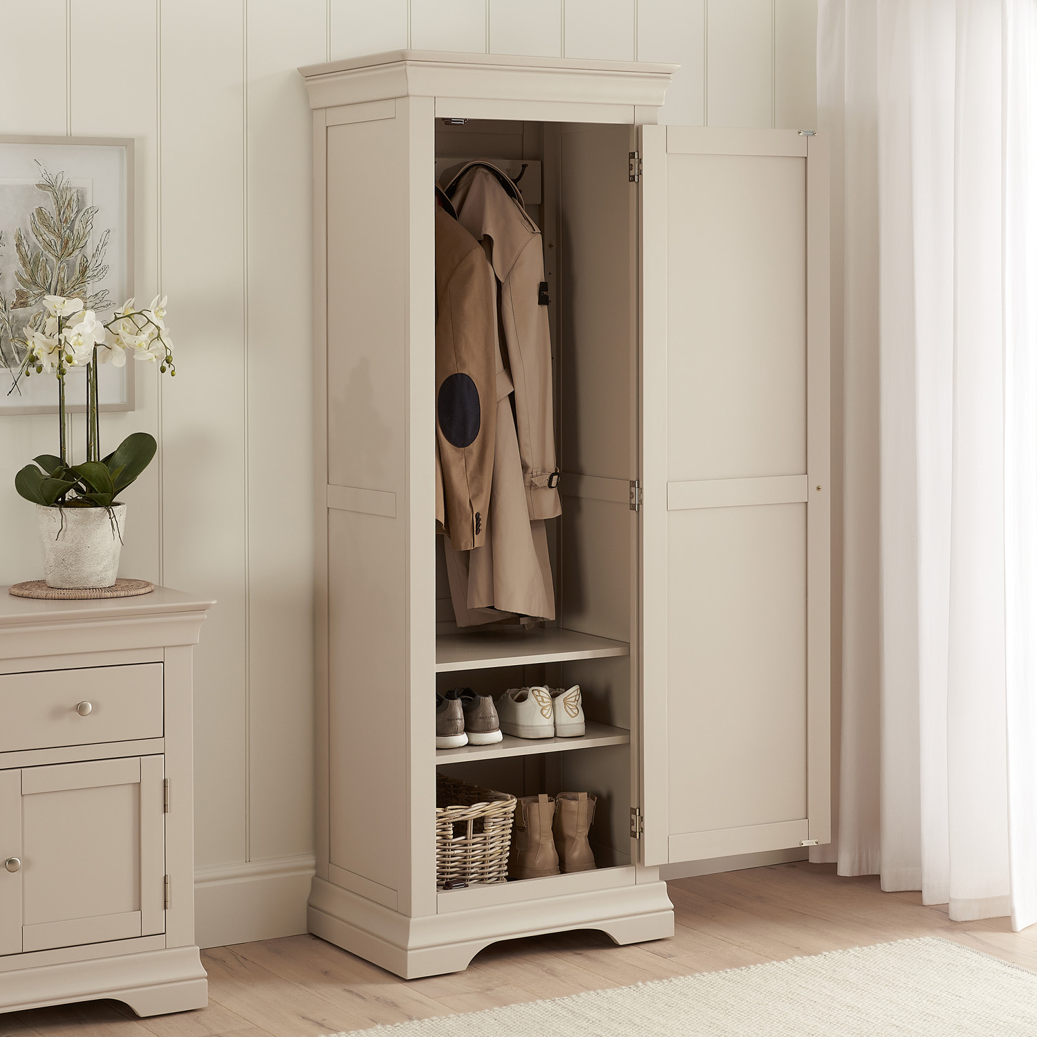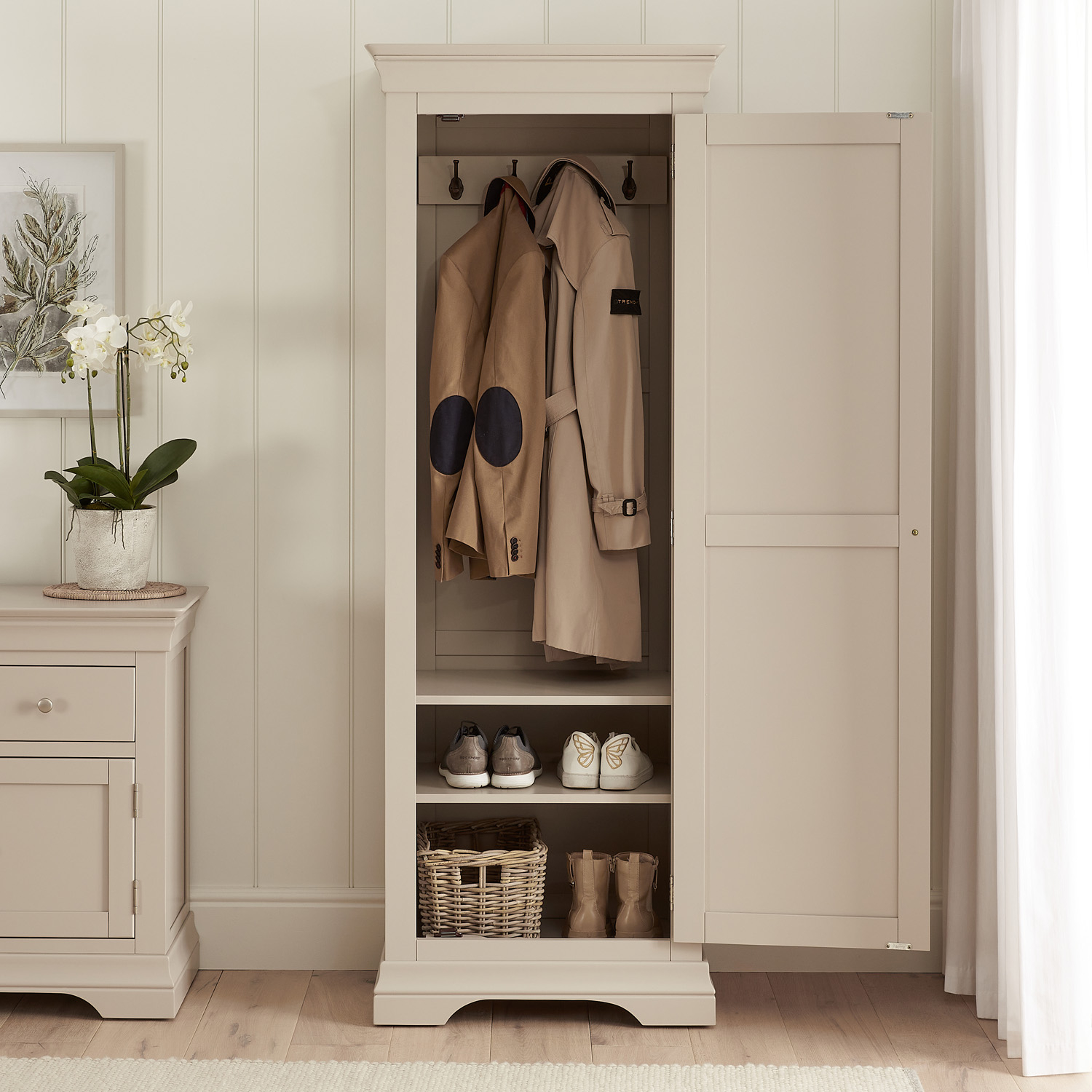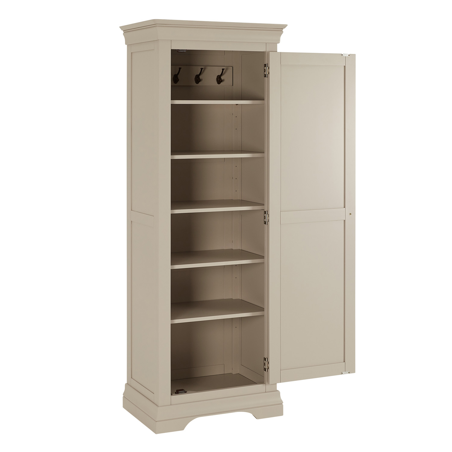 Wilmslow Dove Grey Painted Single Hallway Cupboard – Add a touch of luxury to your hallway with this large single door coat and shoe cupboard. It is a beautifully crafted for practical hallway storage. Inside, you'll find four double coat hooks and five height-adjustable and removable shelves, allowing you to tailor the storage space to your needs. Whether you're looking to neatly hang coats while storing shoes below or prefer to utilise all shelves for dedicated shoe storage, this cupboard adapts effortlessly. Beyond hallway organisation, its multi-purpose design makes it ideal for various spaces in your home. Use it in the kitchen as a larder cupboard, in a utility room for general household storage, or upstairs as a linen cupboard. With endless possibilities, this timeless piece blends practicality with refined craftsmanship.