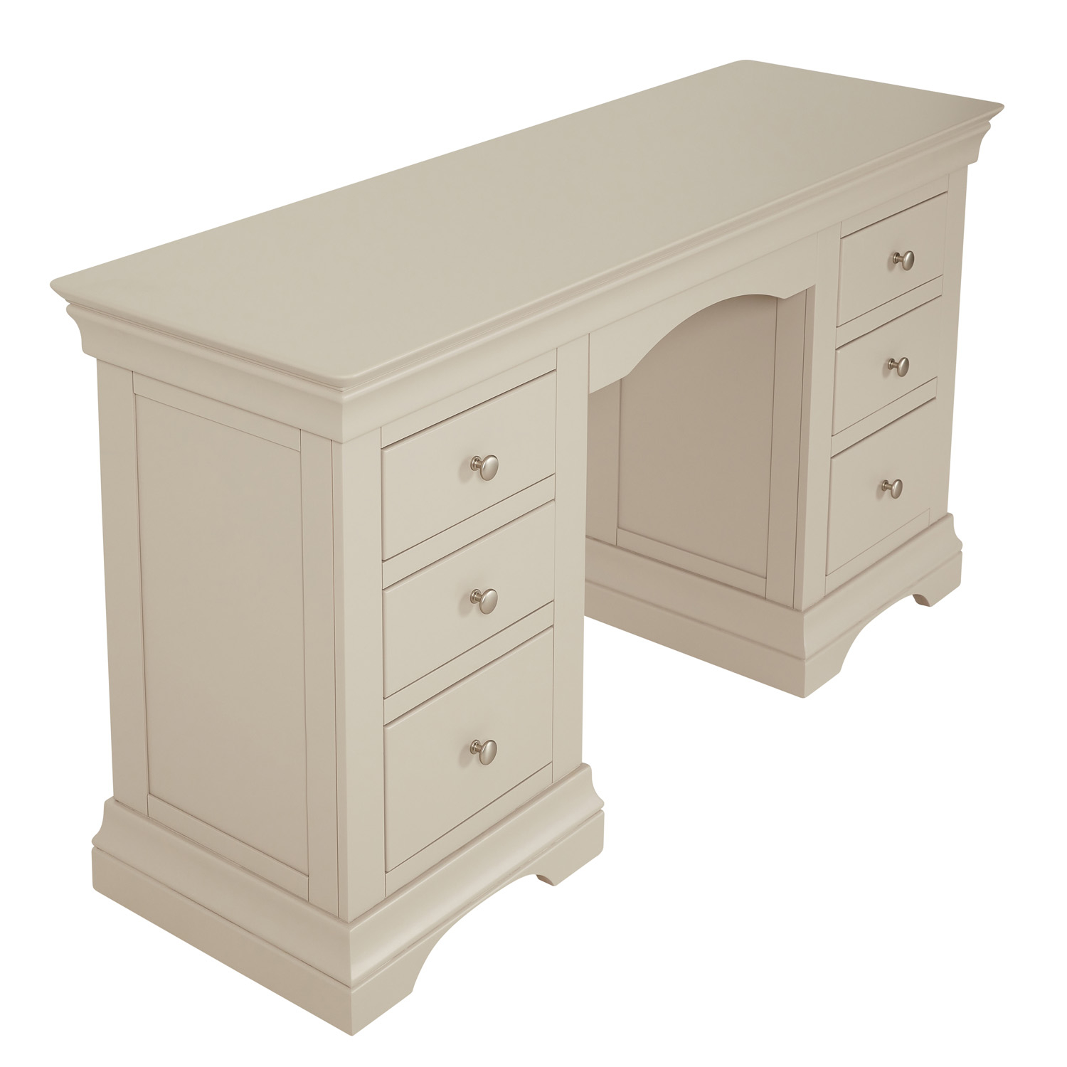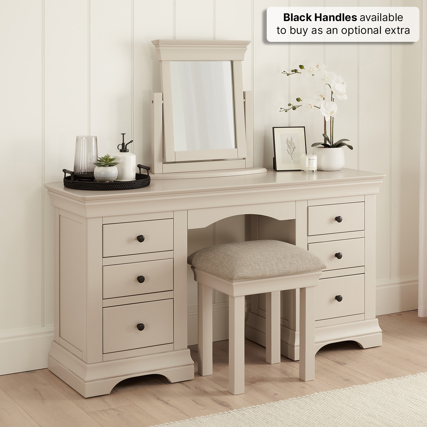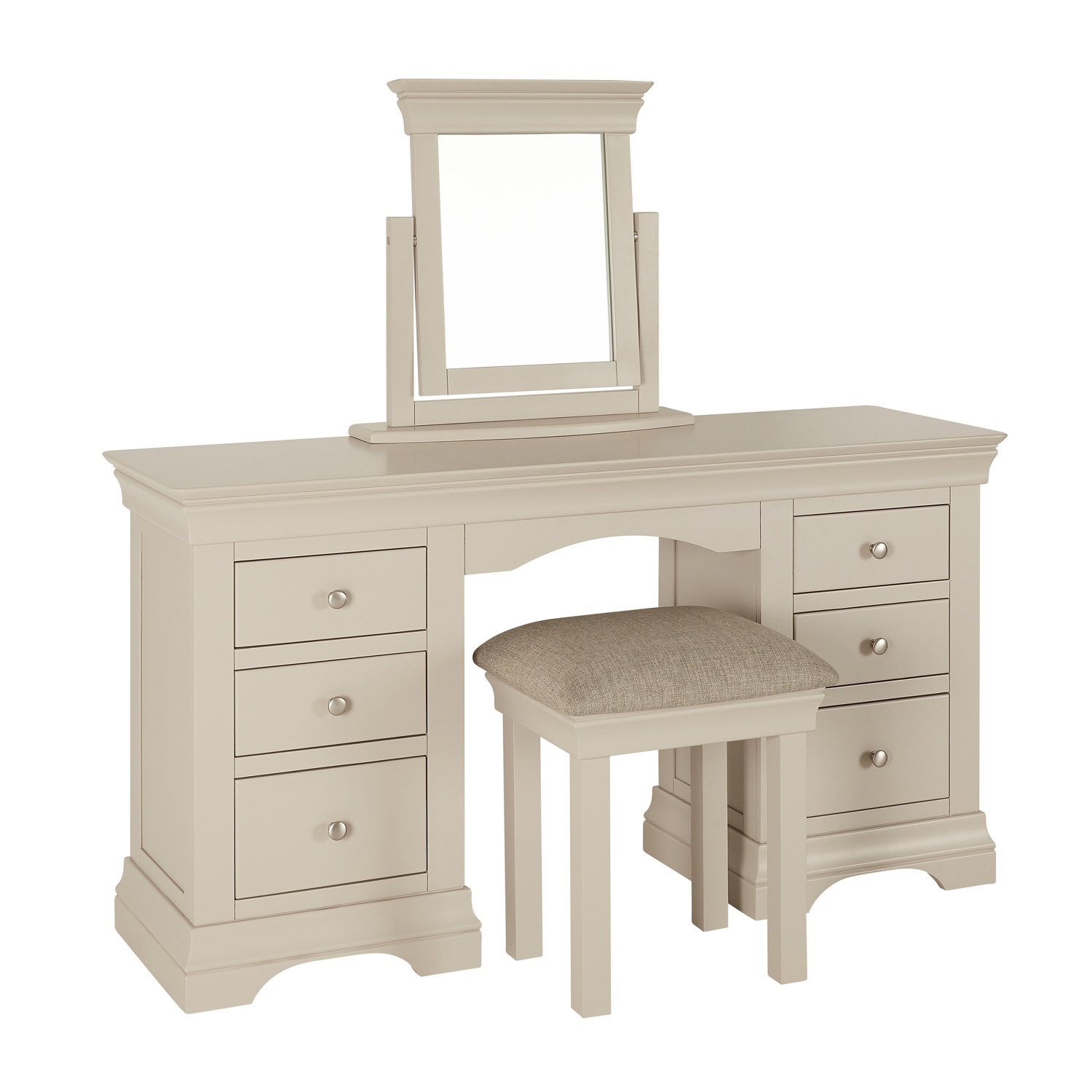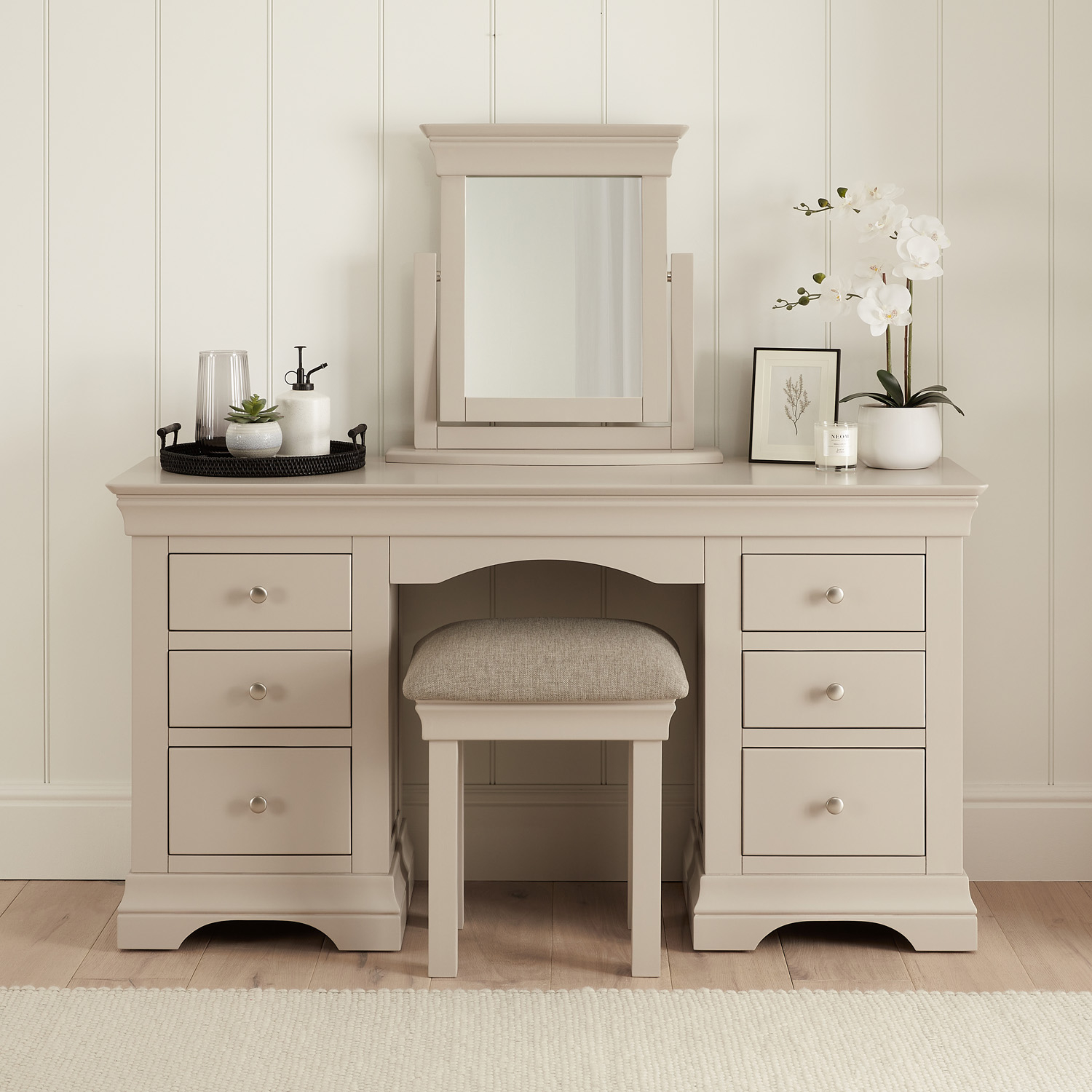Wilmslow Dove Grey Twin Pedestal Dressing Table Set with Mirror and Stool – Add a touch of luxury to your bedroom with this elegant dressing table set. This three piece set includes the dressing table, vanity mirror and stool. The dressing table has a spacious table top area and six large drawers in the pedestals. The stool is very hand upholstered in a natural fabric and is very comfortable due to the thick foam cushioning. The vanity mirror angle can be adjusted to suit your needs and the base of the mirror can be secured to the back of the dressing table top using the metal joining brackets that are supplied.