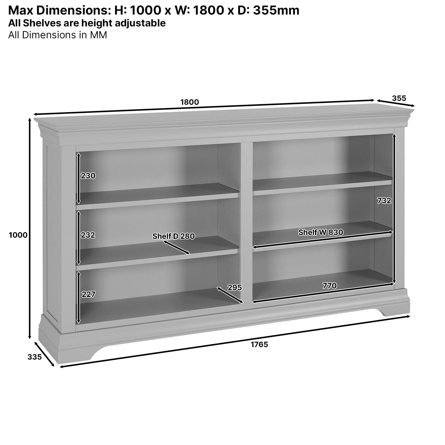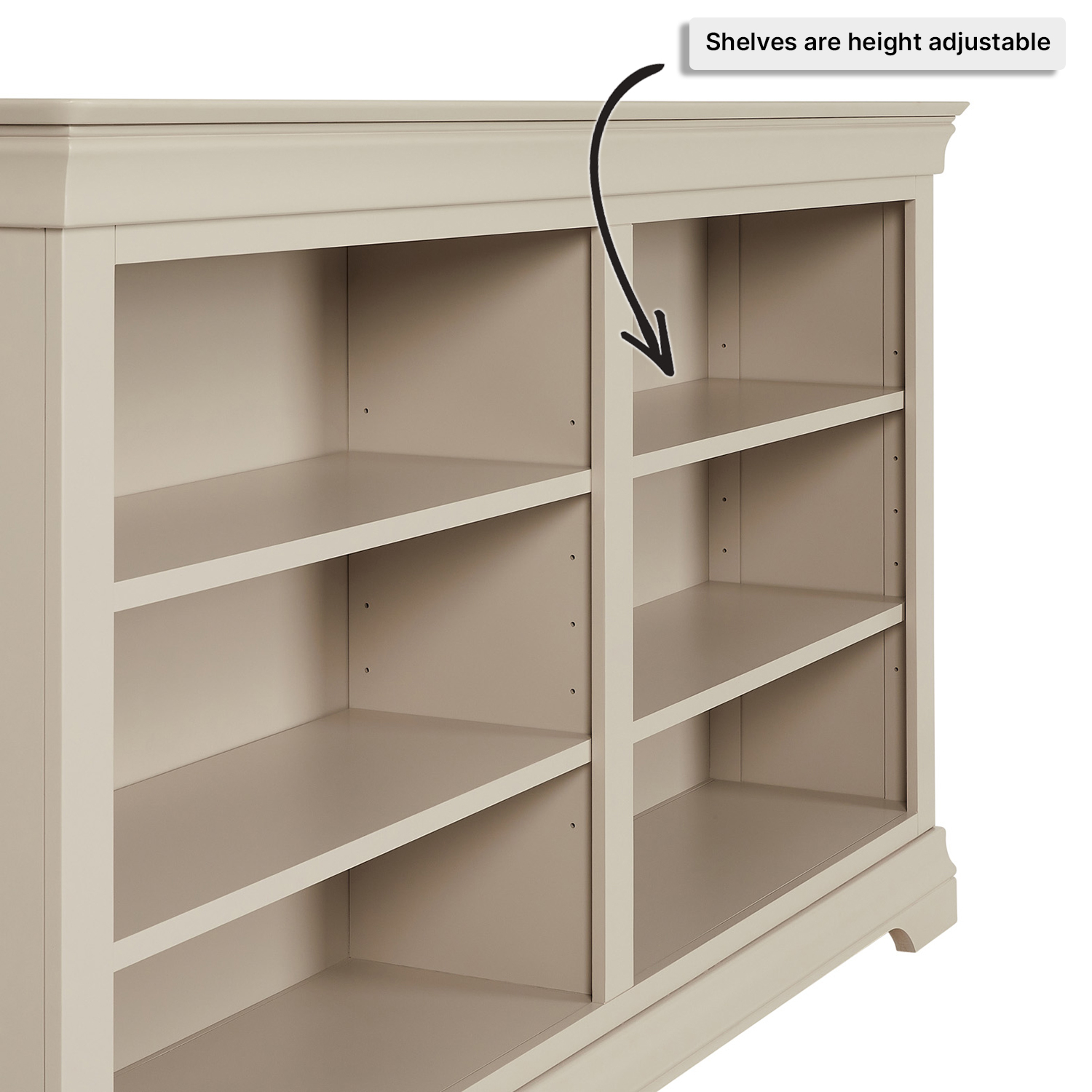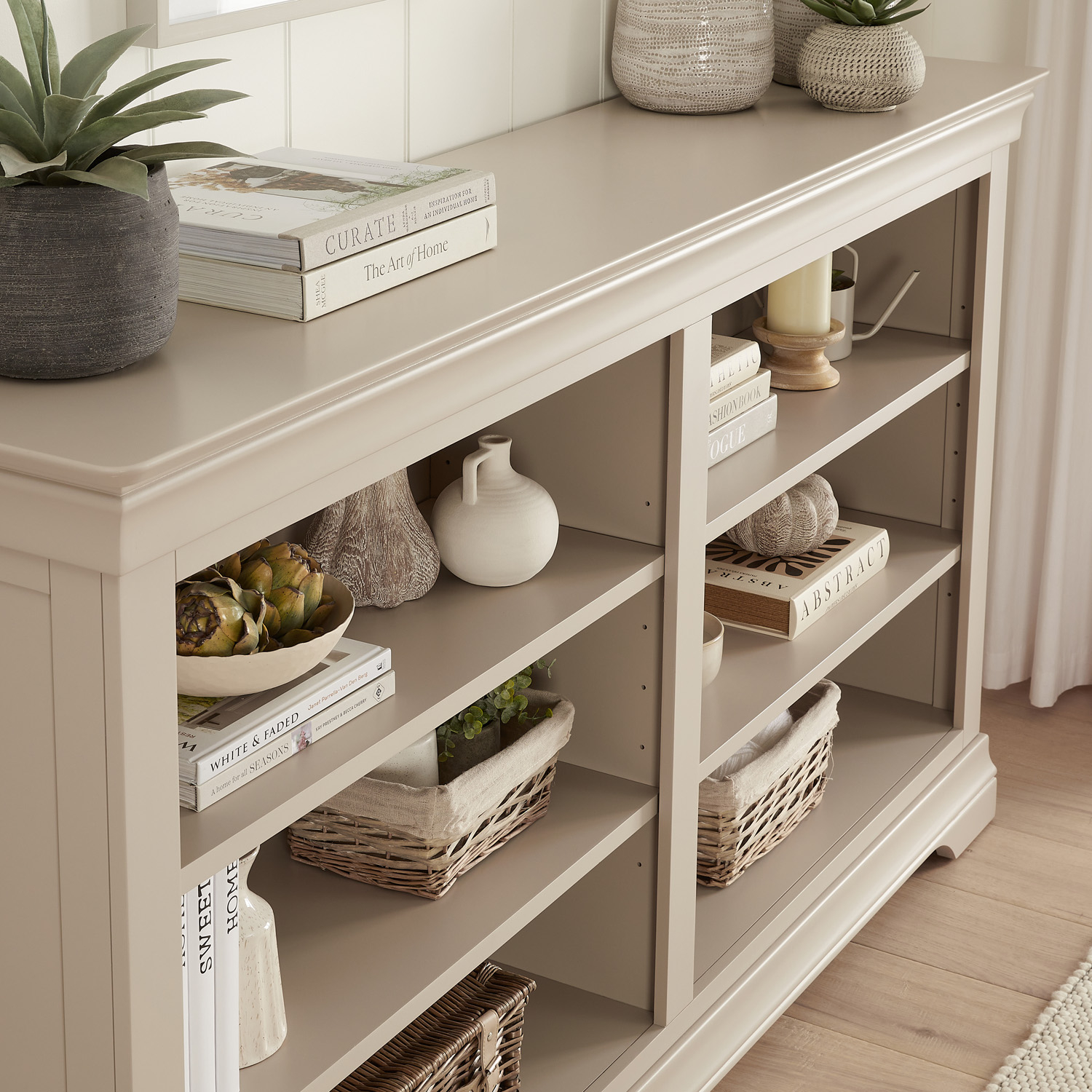 Wilmslow Dove Grey Painted Wide Low Double Bookcase – Elevate your living space with the timeless elegance of the Wilmslow wide low double bookcase. This generously proportioned bookcase offers ample room for books, décor, and treasured keepsakes. Four fully height-adjustable shelves allow you to tailor the layout to suit your display preferences, combining practicality with refined style.