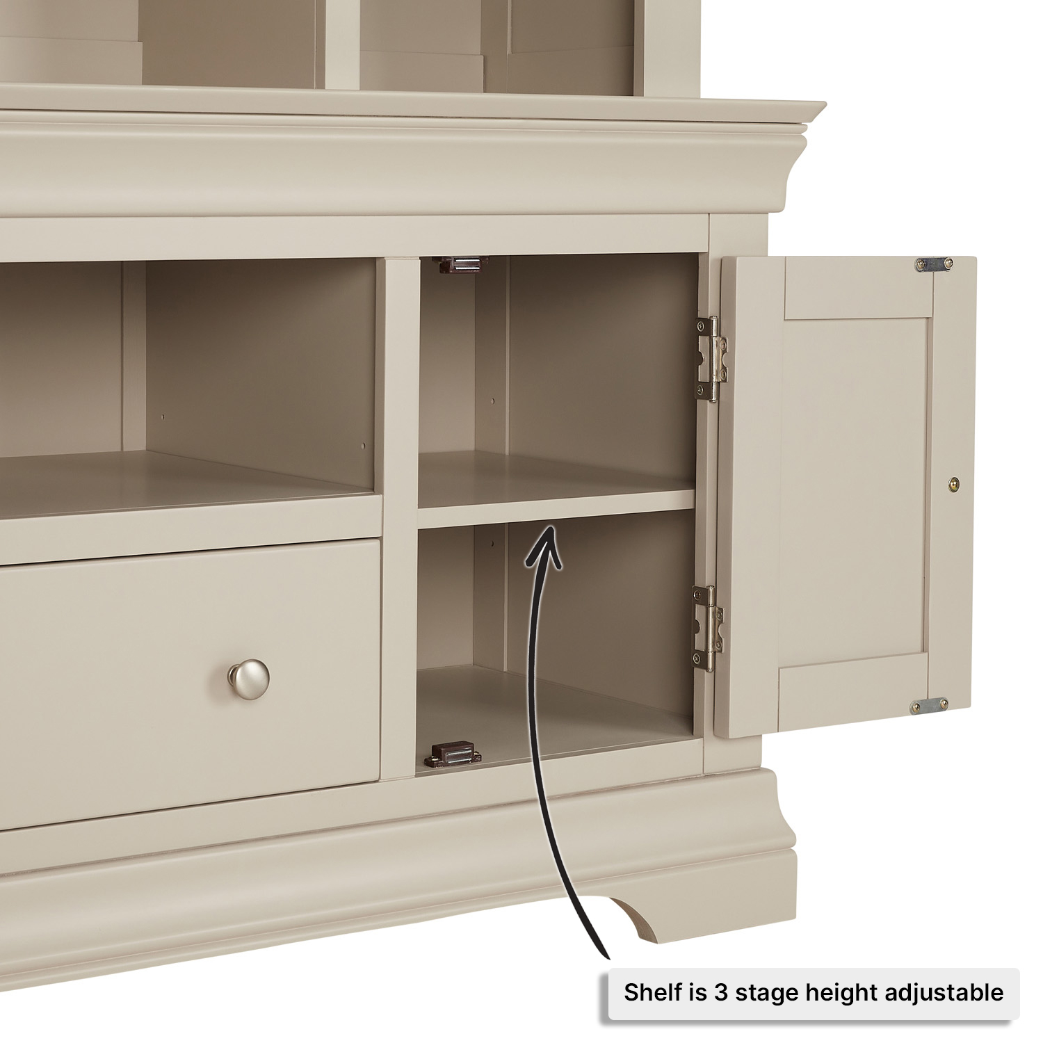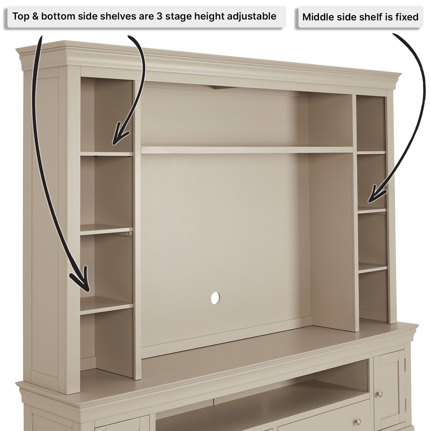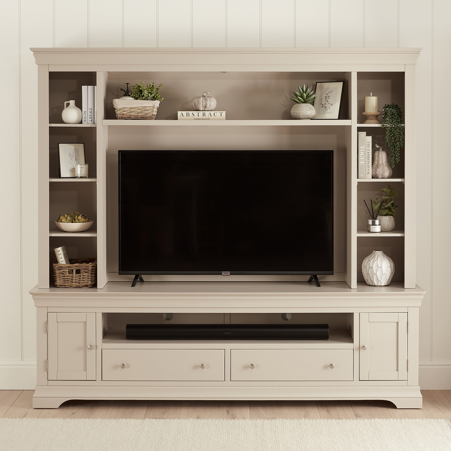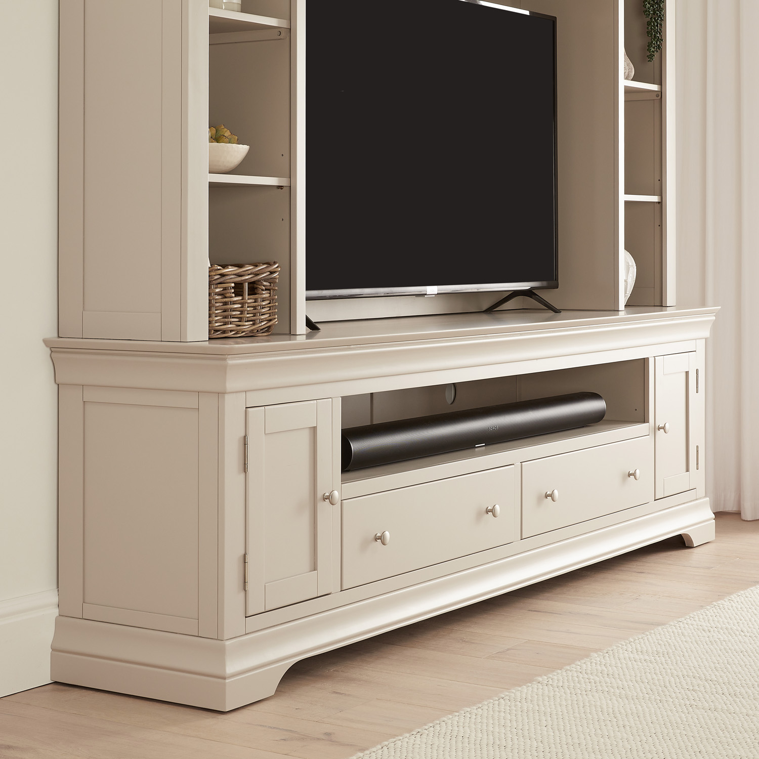 Wilmslow Dove Grey Painted XXL Widescreen TV Media Wall Unit – Add a touch of luxury to your living space with this XXL widescreen TV media wall unit. Thoughtfully designed as the ultimate TV media wall unit, suitable for TV’s up to 60” in size or TV’s no larger than W 1400 x H 920mm. It’s a very impressive piece of living room furniture that will no doubt complete any wall. It offers huge amounts of storage space for all your living room TV and media equipment.