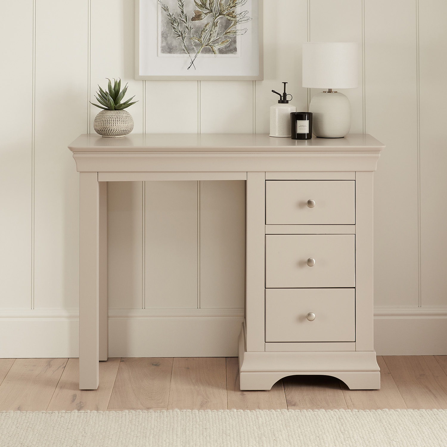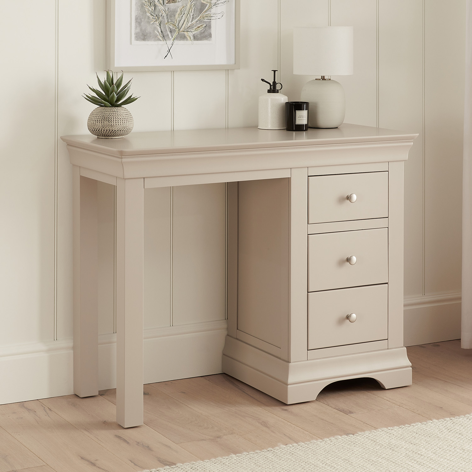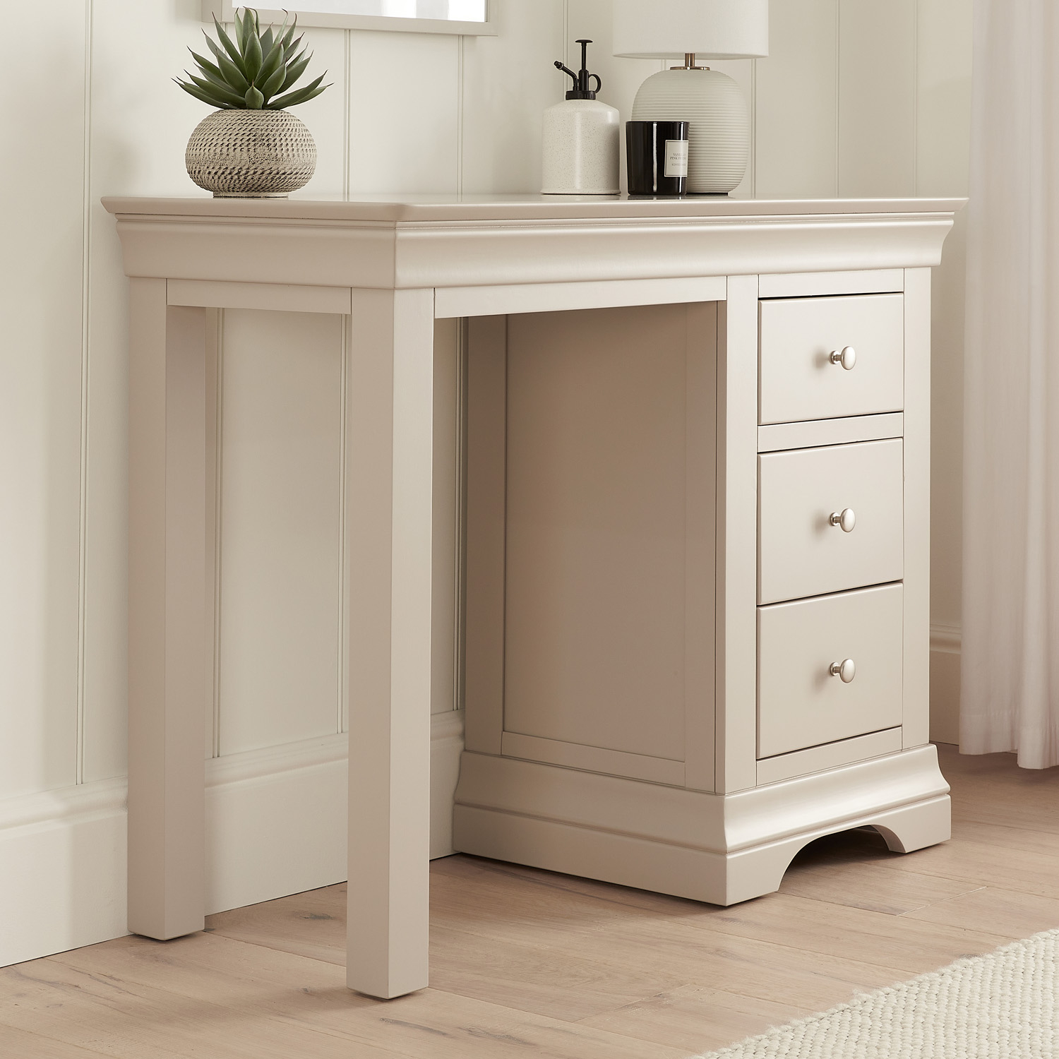 Wilmslow Dove Grey Painted Single Pedestal Dressing Table – Add a touch of luxury to your bedroom with this elegant dressing table. The spacious dressing table top area can be used to display a dressing table mirror and make up items while the three spacious drawers provide plenty of storage space for your beauty products and accessories.