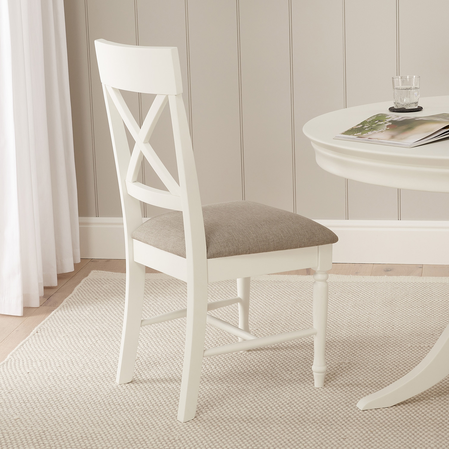 Wilmslow White Painted Dining Chair – Add a touch of luxury to your dining room with this elegant dining chair. It is very comfortable due to the thick cushioned seat pad which is hand upholstered in a natural fabric. This natural fabric is hard-wearing for everyday use and is easily cleanable. The neutral fabric colour blends effortlessly into most home decors. The chair frame features a cross back rest design and elegantly turned front legs and cross stretchers.