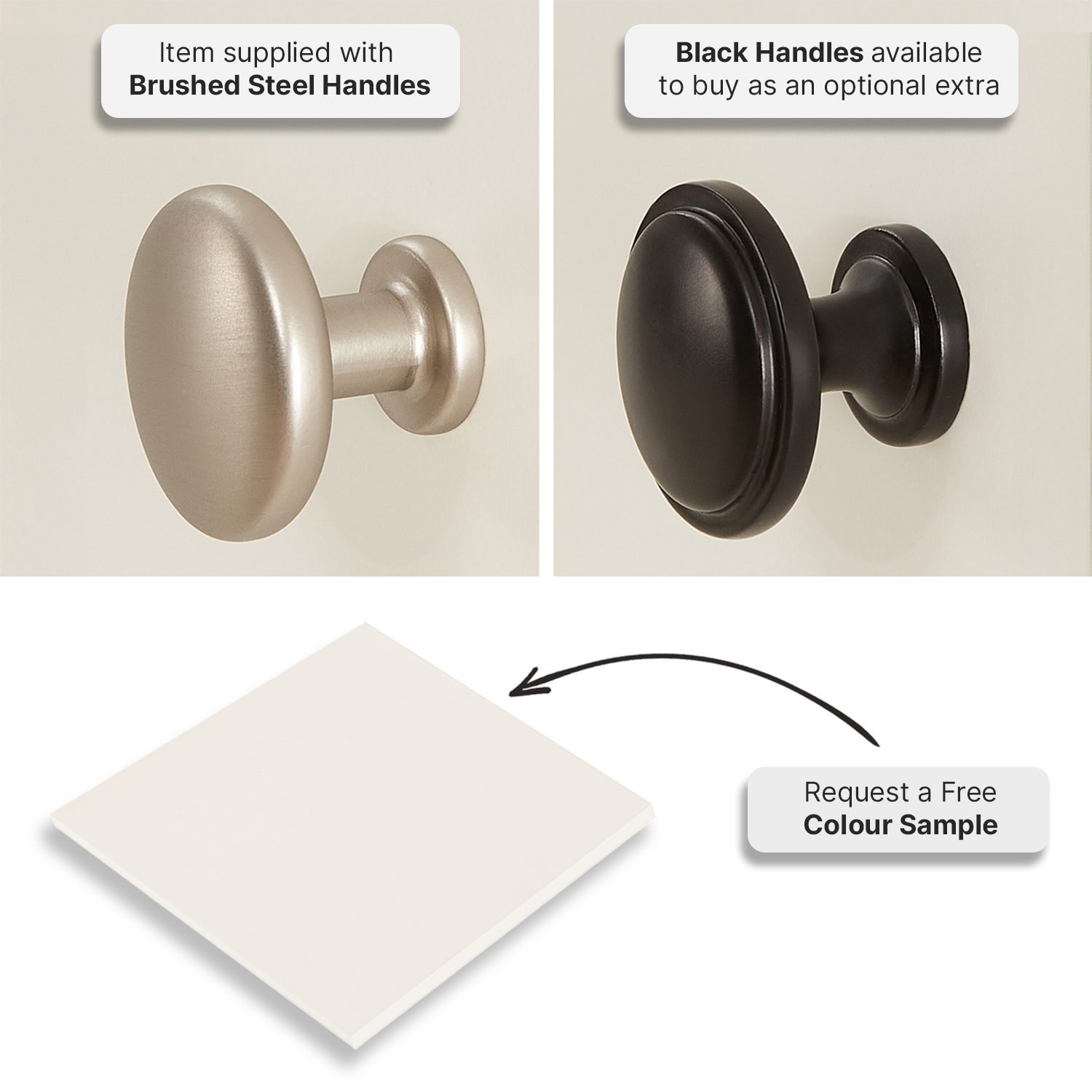Stylish Brushed Steel Handles – This range is supplied with round brushed steel handles that complement the elegant design. Additionally, black handles are available to purchase as an optional extra, allowing you to customize the look to suit your personal style.